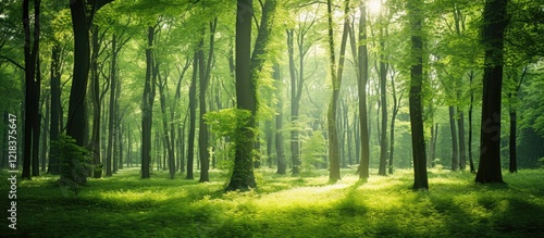 Naklejka premium Lush green forest with tall trees illuminated by sunlight filtering through...