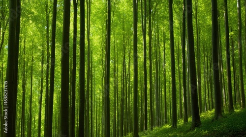© Matthew, Obraz premium Lush Green Forest with Tall Trees Reaching for the Sky, Sunlight Filtering Through Leaves