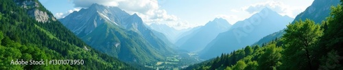 © Phetthanousack, Fototapeta premium Lush green forest with towering mountain peaks, wilderness, granite, scenery