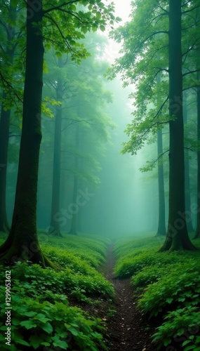 Obraz premium Lush green forest with towering trees and mist, forests, peaceful