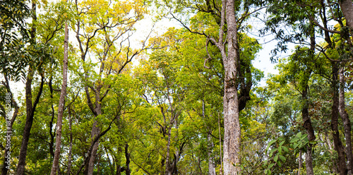 © apirom, Fototapeta premium Lush Green Forest with Towering Trees and Vibrant Canopy Layers