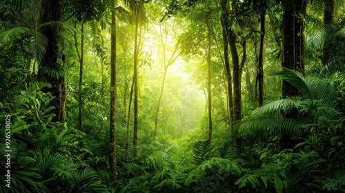 Fototapeta premium Lush green forest with towering trees, vibrant ferns, and soft light...