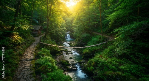 © Iqbal, Obraz premium Lush Green Forest with Waterfall, Suspension Bridge, and Sun Rays at Golden Hour