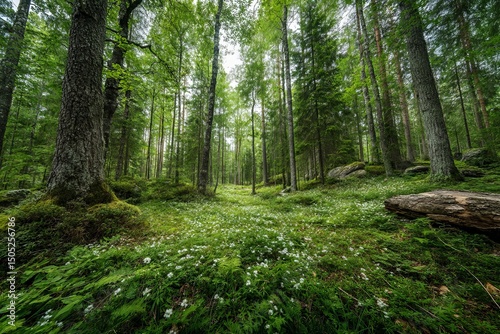 Naklejka premium Lush green forest with wildflowers during a serene morning in nature's embrace