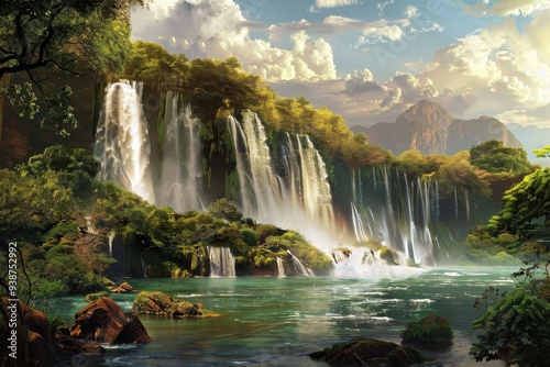 Obraz premium Lush Green Forested Waterfall Cascading into a Tranquil Pool
