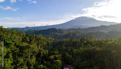 Fototapeta premium Lush green forests cascading down a hillside, meeting a distant volcanic peak...