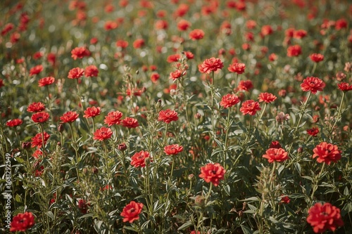 Fototapeta premium Lush green garden filled with vibrant red blossoms in a natural setting, featuring floral textures and summer vibes