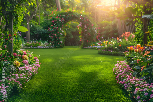 Fototapeta premium Lush Green Garden Under a Romantic Sunset: A Perfect Blend of Elegance and...
