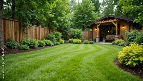 Fototapeta premium Lush Green Garden with Trimmed Lawn and Charming House Surrounded by Trees...