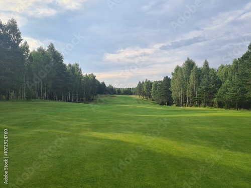 © Nadzeya, Obraz premium Lush green golf course landscape surrounded by trees during late afternoon
