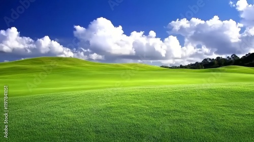 Fototapeta premium Lush green golf course under a blue sky with puffy clouds