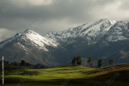 © Nittaya, Fototapeta premium Lush green golf course with snowy mountain peaks under cloudy skies