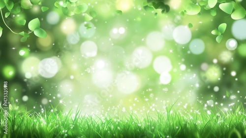 © EchoFrame, Fototapeta premium Lush Green Grass and Clover Leaves with Bokeh Lights Background in a Magical Forest Setting Nature Scene