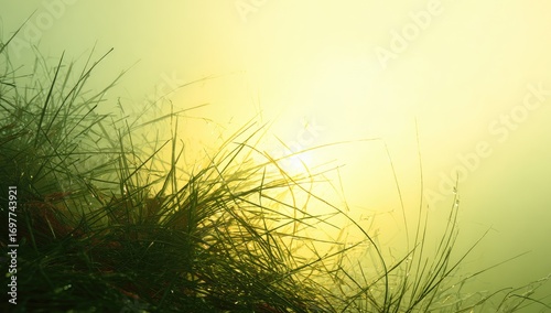 © khuraikah, Obraz premium Lush green grass blades, bathed in soft, golden sunlight filtering through a misty atmosphere, creates a serene and peaceful scene.