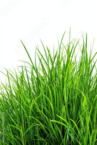 Obraz premium Lush Green Grass Blades Growing Upward on White Background in Bright...