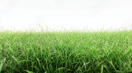 Fototapeta premium Lush green grass blades stretch towards a bright, soft sky, evoking a sense of serene nature and peaceful simplicity in this captivating landscape scene right here.