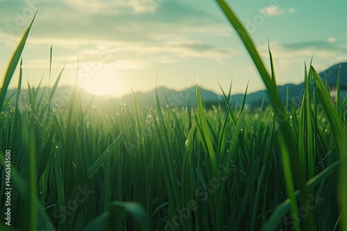 © Ibnu, Fototapeta premium Lush green grass field at sunrise