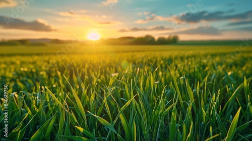 Fototapeta premium Lush Green Grass Field at Sunset