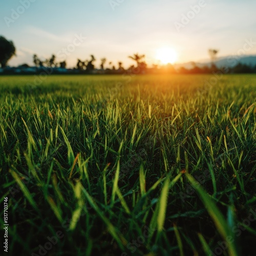 Fototapeta premium Lush green grass field at sunset. Golden light filters through blades of...