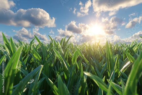 Fototapeta premium Lush green grass field at sunset, sun shining through fluffy white clouds in a vibrant blue sky