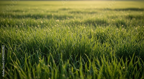 © DARYATIK, Obraz premium Lush green grass field bathed in golden sunlight