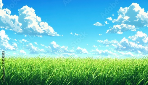 Fototapeta premium Lush Green Grass Field Under a Blue Sky with Fluffy Clouds