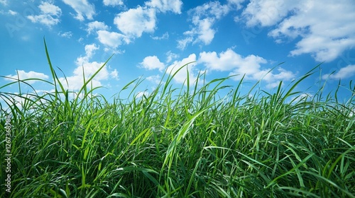Obraz premium Lush Green Grass Field Under a Sunny Blue Sky with Fluffy White Clouds Nature...