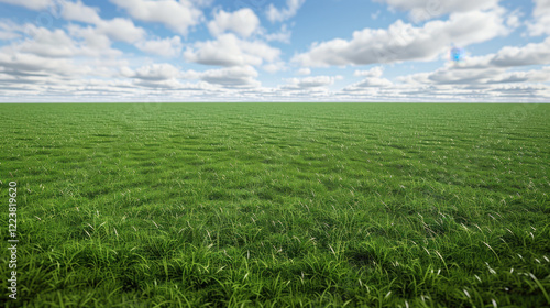 Naklejka premium Lush green grass field under bright blue sky with fluffy clouds, creating...