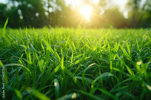 © smth.design, Fototapeta premium Lush Green Grass Field with Sunrise Background in Springtime