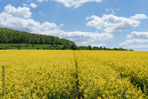 © AdobeTim82, Obraz premium Lush green grass field with yellow field in background, under blue sky