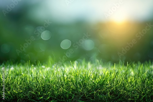 Fototapeta premium Lush green grass in soft sunlight, blurred background
