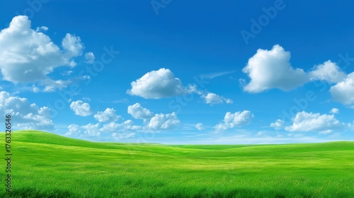 Fototapeta premium Lush Green Grass Landscape Under Bright Blue Sky with Fluffy Clouds