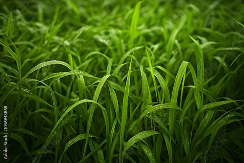 Obraz premium Lush green grass with droplets, evoking a fresh and vibrant natural environment.