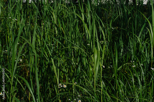 Fototapeta premium Lush green grass with small white flowers