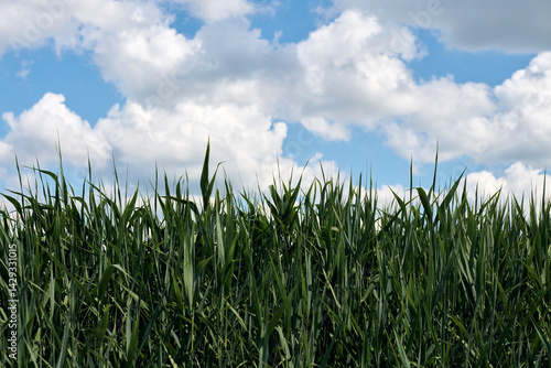 Fototapeta premium Lush green grass with tall stalks swaying under vibrant blue sky filled with fluffy white clouds on sunny day, top copy space