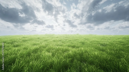 Obraz premium Lush green grassland under a dramatic cloudy sky, perfect for a peaceful nature scene.