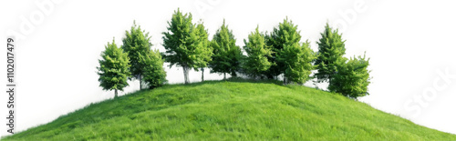 © Wannaeka, Fototapeta premium Lush Green Hill Landscape with Trees and Yellow Flowers Under a Dark Sky - Serene Nature Scene