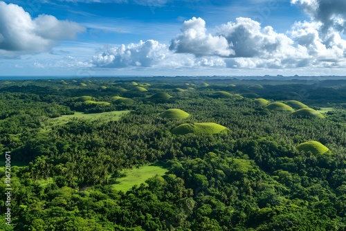 © paper later, Obraz premium Lush Green Hills and Forested Landscape with a Blue Sky and White Clouds