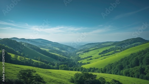 © Sona, Fototapeta premium Lush green hills and valleys under a blue sky with wispy clouds. The landscape features rolling terrain and dense forests.