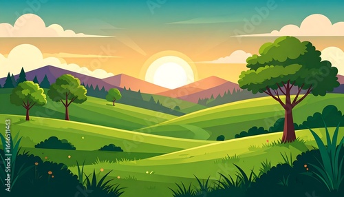 © bino, Fototapeta premium Lush Green Hills at Sunrise, Peaceful Mountain Landscape Illustration.