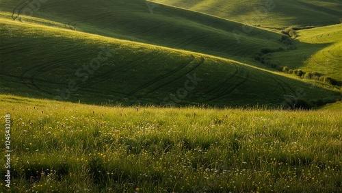 Fototapeta premium Lush green hills gently undulate under soft sunlight, with traces of paths...