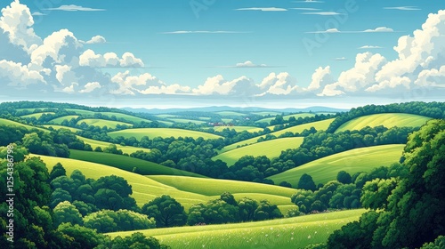 Fototapeta premium Lush Green Hills Under a Bright Blue Sky with Fluffy Clouds and Rolling...