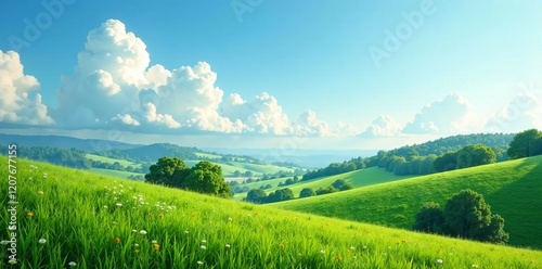 Fototapeta premium Lush green hills under a bright blue sky with fluffy white clouds in the...