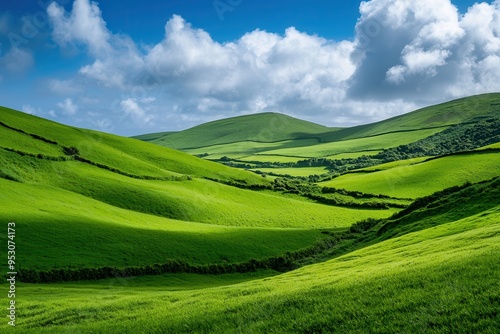 © Uliana, Fototapeta premium Lush green hills under a bright sky during St. Patrick's Day in Ireland.