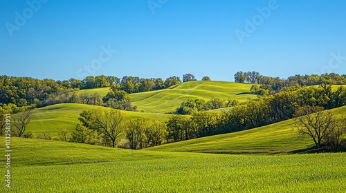 Fototapeta premium Lush green hills under a clear blue sky, showcasing serene natural beauty.