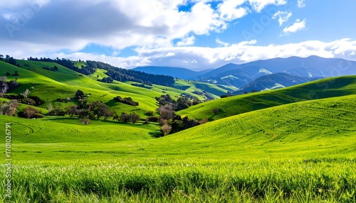 © cahaya, Fototapeta premium Lush green hills under a partly cloudy sky