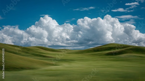 © Dina, Fototapeta premium Lush green hills under a vast, cloudy sky.