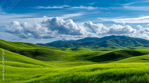 Fototapeta premium Lush green hills under a vibrant blue sky with dramatic clouds in a scenic...