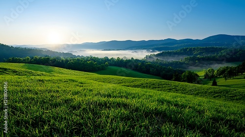 © Arthur Constantine, Fototapeta premium Lush Green Hills Under Bright Blue Sky at Sunrise in Landscape
