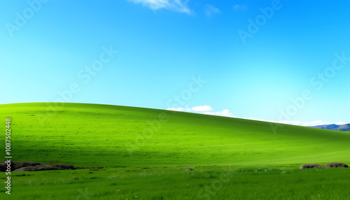 Fototapeta premium Lush green hills under bright blue sky, nature conservation message, copy space